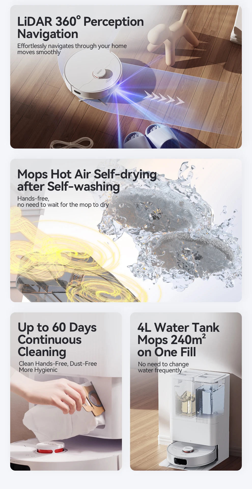 Scopri il JONR P20 Pro, il robot aspirapolvere di ultima generazione che combina aspirazione potente da 8000Pa, lavaggio intelligente e stazione autopulente per una casa impeccabile senza sforzo.