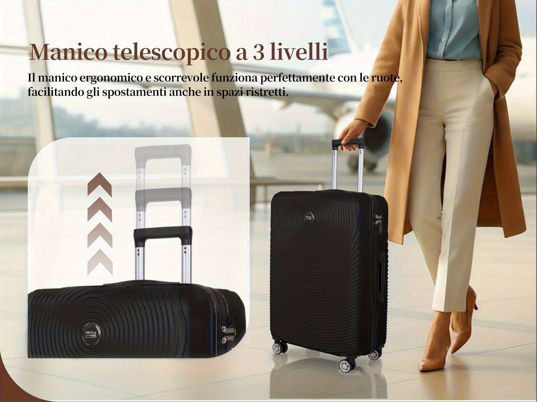 - Ruote silenziose a 360° - Massima manovrabilità e comfort anche negli aeroporti più affollati